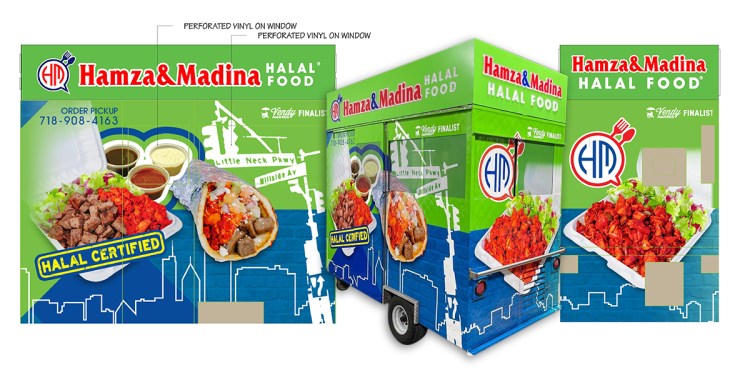 This client wanted to refresh the design of the vinyl wrap for their food truck. I kept the bold graphic lines and shapes I’d arranged previously but brightened the colors. I edited their platter and gyro photos so they could have visuals of all their food offerings. They liked the van so well they had me create a similar design for one of their food carts. Shown here.